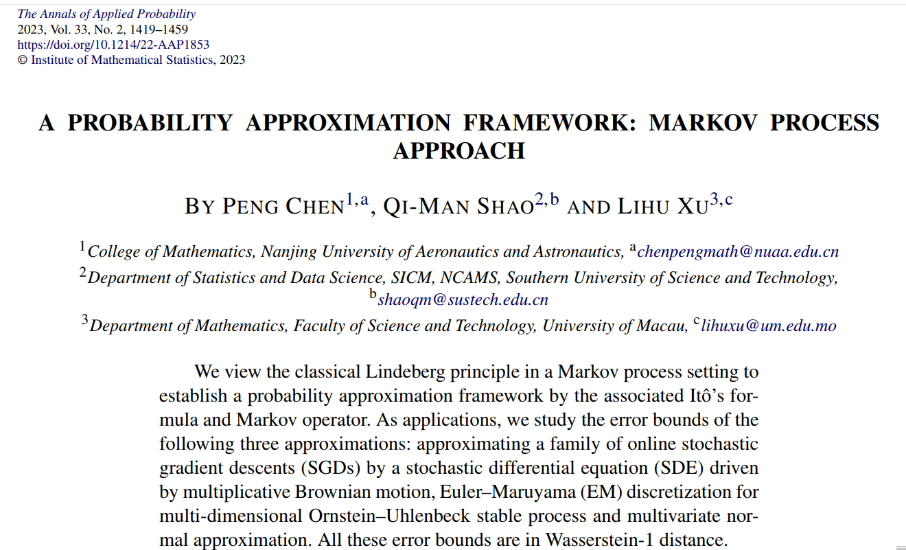 日前,beat365概率统计系教师陈鹏及其合作者在概率统计顶级期刊《The Annals of Applied Probability》上发表了题为“A Probability Approximation Framework: Markov Process Approach”的研究论文。