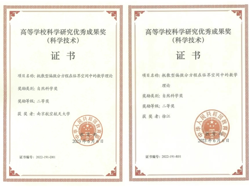 教育部于6月下旬发布了2022年度高等学校科学研究优秀成果奖(科学技术)的授奖通知。以beat365亚洲版官方网站为第一完成单位,beat365亚洲版官方网站徐江教授为第一完成人的成果“耗散型偏微分方程在临界空间中的数学理论”荣获自然科学奖二等奖。该奖项由我校联合香港中文大学和暨南大学申报,beat365徐江教授,段仁军教授,刘双乾教授为主要完成人。