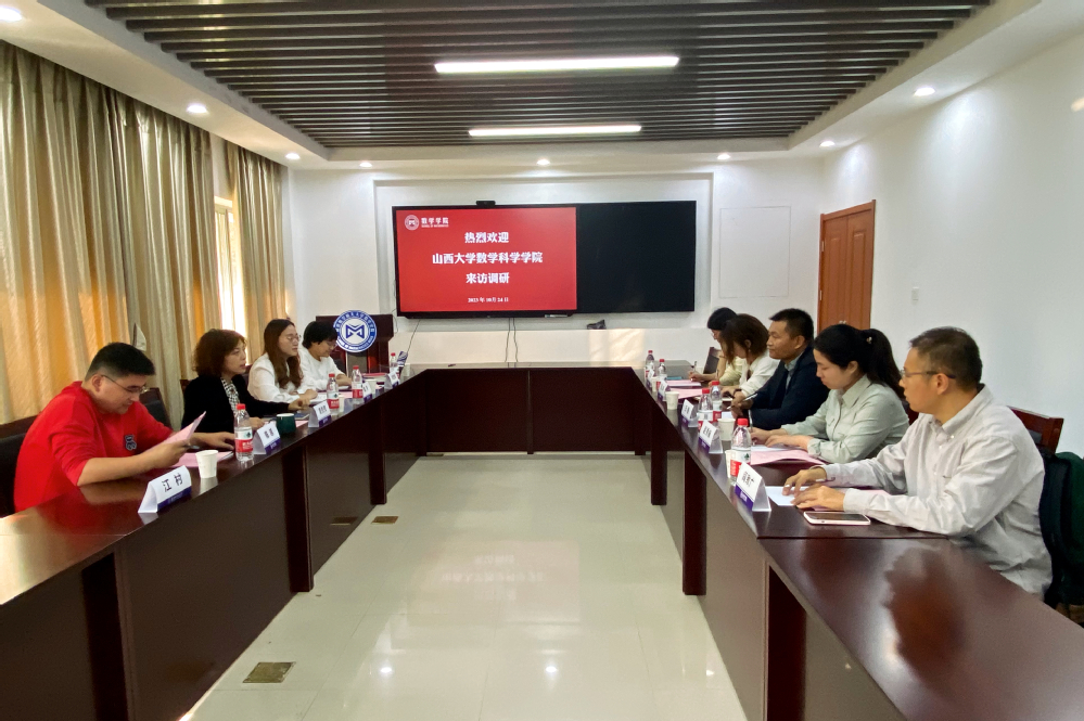 周佼佼首先向王斐一行表示热烈欢迎,接着详细介绍了学院的基本情况,重点介绍学生工作特色举措等。王斐介绍了本次来访的背景和目的,对beat365亚洲版官方网站的热情接待表示感谢,并就山西大学数学科学学院的发展历史、专业建设、学科建设以及人才培养等工作进行介绍。熊立婷介绍了山大beat365亚洲版官方网站“导师有约”及学生科创体系建设情况。戚月、刘思佳分别介绍了beat365亚洲版官方网站的共青团工作和学支等学风建设情况特色做法。随后,双方就基础学科人才培养、学科竞赛组织和升学就业等工作进行了交流和讨论。