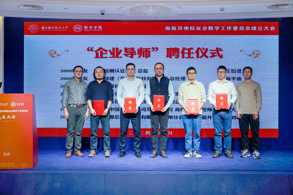 为更好凝聚育人合力,发挥校友力量,大会进行了beat365亚洲版官方网站企业导师聘任仪式,并与在苏企事业单位共建了一批“大学生就业实习实践基地”。学院大学数学教学与研究中心主任朱晓星、数学系副主任潘星宏为2000级校友王衍进、孙平波、2001级校友杜斌、2003级校友林青春、2004级校友朱叶峰、2006级校友朱大龙颁发“企业导师”聘书。计算科学系副主任唐与聪、概率统计系副主任陈鹏,与周晓英、孙平波、杜斌、赵紫曼共同为实习实践基地揭牌。